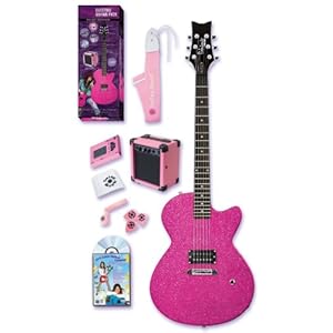 Rock Candy electric guitar (atomic pink), amplifier, electronic tuner, guitar strap, picks, string winder, polish cloth, gig bag, instructional DVD